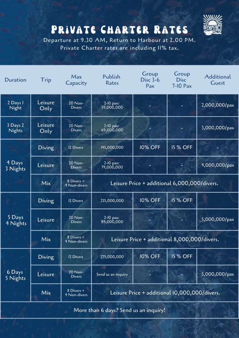 The minimum duration for a private charter is 4 days, and the maximum is 8 days. Since we operate exclusively in Komodo, this range allows us to optimize the itinerary based on available dive sites, the season, and weather conditions.